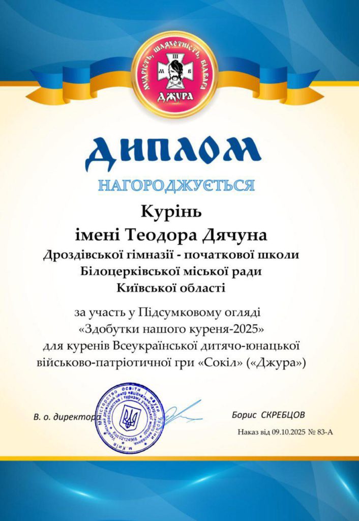 Вже рік на базі Дроздівської гімназії-початкової школи функціонує курінь імені Теодора Дячуна. І в цьому році гімназія вперше посвячує цілий курінь до складу якого входить три рої: «Юні патріоти» (молодша вікова група) – керівник Синчук Інна Олександрівна , «Патріоти» (середня вікова група) та «Незламні патріоти» (старша вікова група) – керівник Шпуганич Аделіна Сергіївна . Сьогодні ми вкотре переконуємося, що майбутнє нашої нації в надійних руках. Шановні батьки та громада, ваша підтримка є неоціненною. Дякуємо вам за те, що ви допомагаєте нашим дітям стати гідними продовжувачами славетного козацького роду.